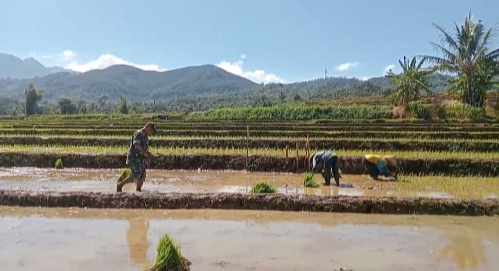 Babinsa Kodim Ponorogo Terjun ke Sawah Bantu Petani Tanam Padi