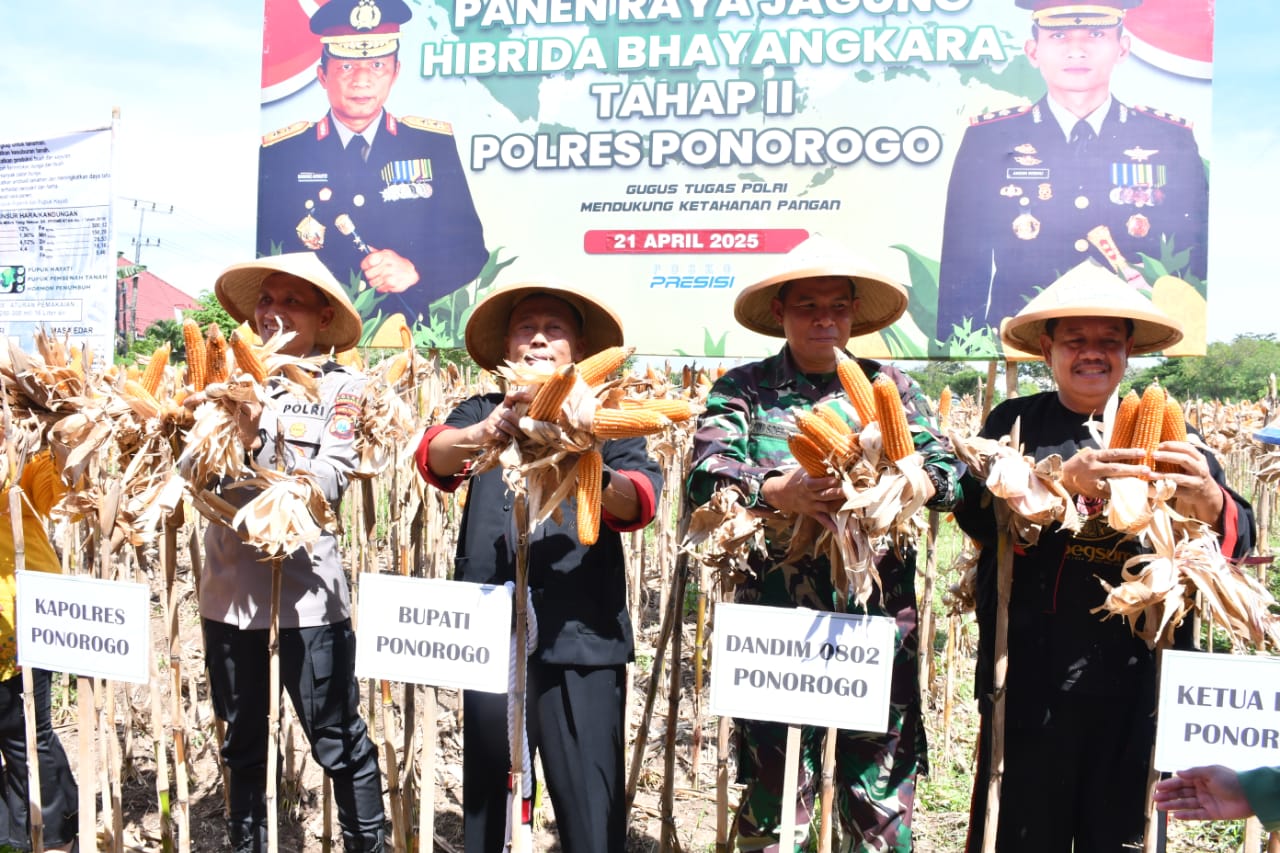 Panen jagung hibrida bhayangkara dimulai usai penyerahan benih jagung hibrida Bhayangkara kepada Kapolsek jajaran Polres Ponorogo yang diserahkan oleh Bupati Ponorogo, Kapolres, Dandim Ponorogo, Ketua Persit KCK Cab. XVI Dim Ponorogo dan Direktur PT Ponorogo Argo Mandiri).